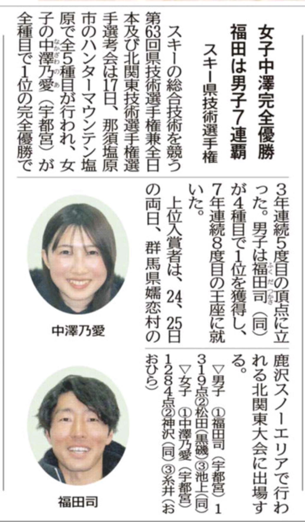 第63回全日本スキー技術選手権大会栃木県代表選手紹介! 3月4日(水)~8日(日)、秋田県たざわ湖スキー場で開催される全日本スキー技術選に以下の5名が代表に選考されました。 男子:福田 司(KS)、矢板 拳(KS) 女子:中澤乃愛(宇都宮)、神沢照代(R&D)、補欠:冨山愛佳(宇都宮) 第63回栃木県スキー技術選手権大会リザルト(1/17)〔黄色セルは北関派遣選手〕 ※福田 司選手(KS)、中澤乃愛選手(宇都宮)が、男女揃って総合優勝!!〔下野新聞1/19掲載記事〕 |